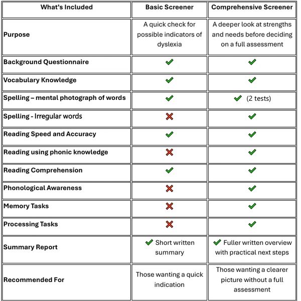 A screener is a helpful first step if you’re unsure whether a full dyslexia assessment is needed. It doesn’t give a diagnosis, but it does highlight areas that may require further investigation or support. I offer two types of screeners so you can choose the level of detail that feels right for you.